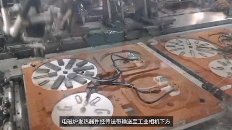 解决方案:电磁炉发热器件经传送带输送至工业相机下方,通过视觉系统定位、识别、检测来料并由机械手定点跟踪、抓取、放至固定位置,实现发热器件与电器底板高精度贴合,自动化工序完成。