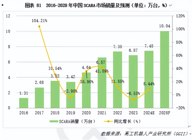 2024年以来,在折叠屏、MR和AR设备等新产品推出,以及换机周期、叠加“以旧换新”补贴政策加码之下,3C电子行业复苏形势明朗,增长势头渐起。受此影响,SCARA机器人销量曲线正“抬头 ”。GGII调研统计数据预测,2024年,中国SCARA市场销量预计为7.45万台,同比增长8.44%。
