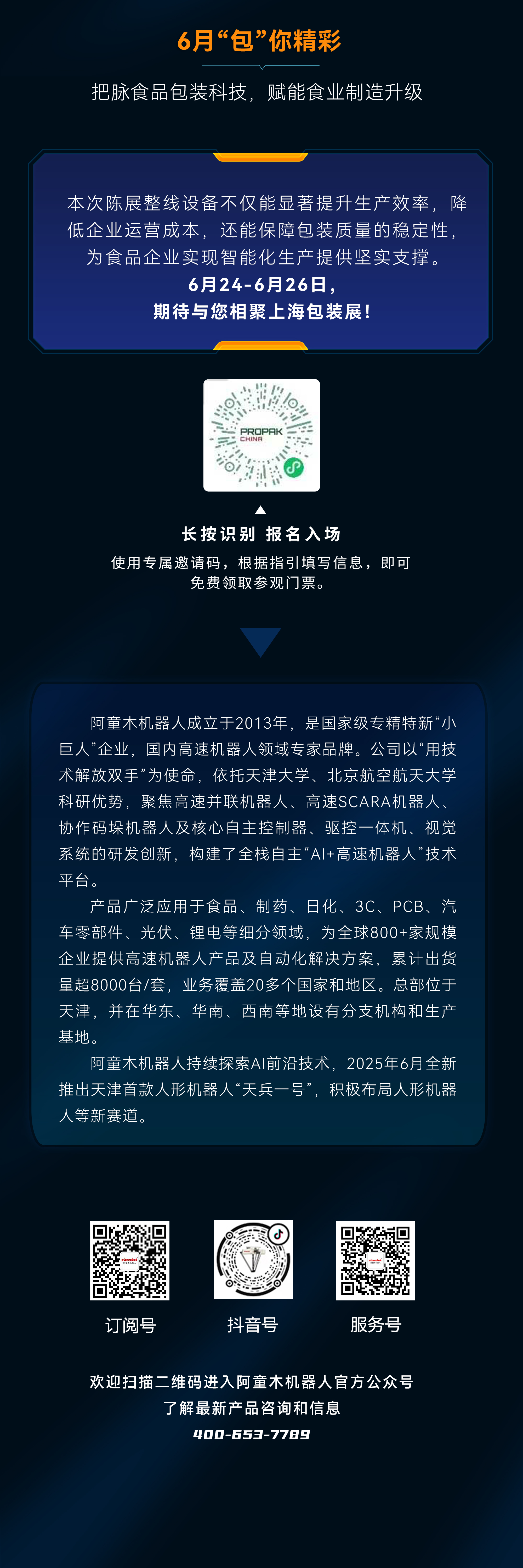 6月“包”你精彩! 阿童木机器人亮相上海包装展 6月24日至26日, 阿童木机器人将携食品包装整线设备亮相上海包装展, 以“把脉食品包装科技,赋能食业制造升级”为核心,带来高效解决方案。 其展品可显著提升生产效率、降低运营成本, 更以稳定包装质量为食品企业智能化生产筑牢根基,期待与您共探行业升级路径!