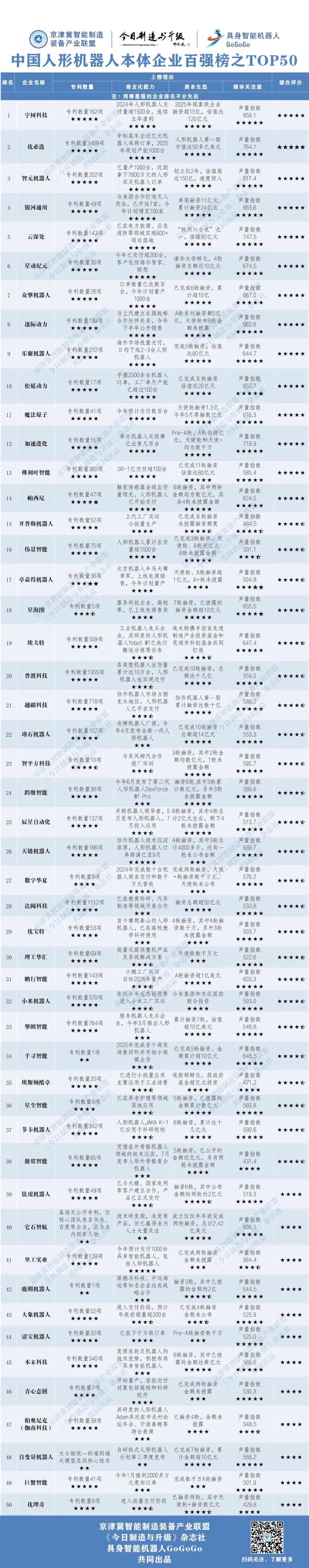 1.榜单入选范围为人形机器人本体研发、制造企业。