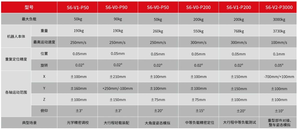 在结构刚性上,S6全系搭载高精度虎克铰(旋转角度范围±60°)与自研零背隙万向节,有效破解了传统并联平台在重载工况下铰链间隙易放大、末端产生抖动的难题。搭配精密滚珠丝杠与高扭矩伺服电机,即便承受3吨重载,依旧可完成平稳的毫米级步进。一台重达3吨的设备以100mm/s速度沿X轴移动,末端偏移量控制在±0.1mm以内,相当于一根头发丝的直径——这正是刚性闭环带来的直观效果。