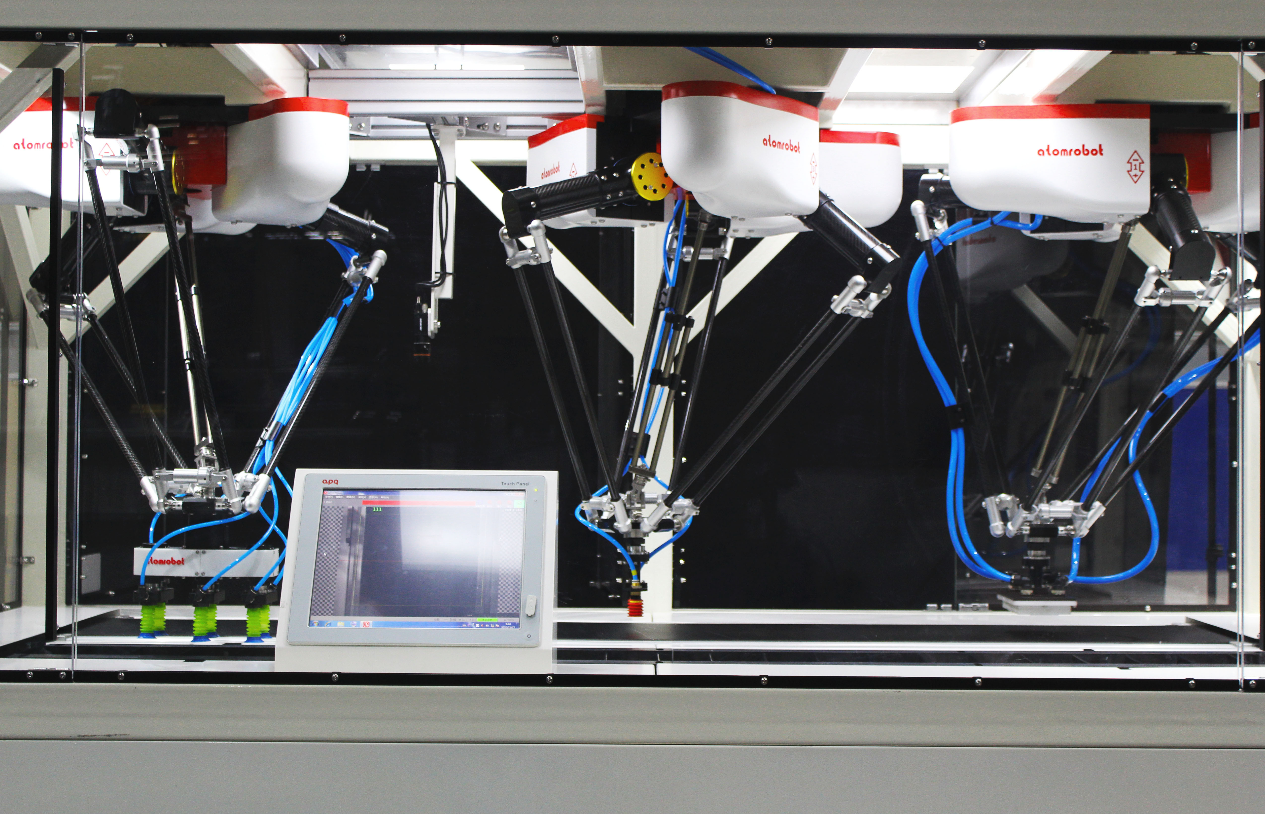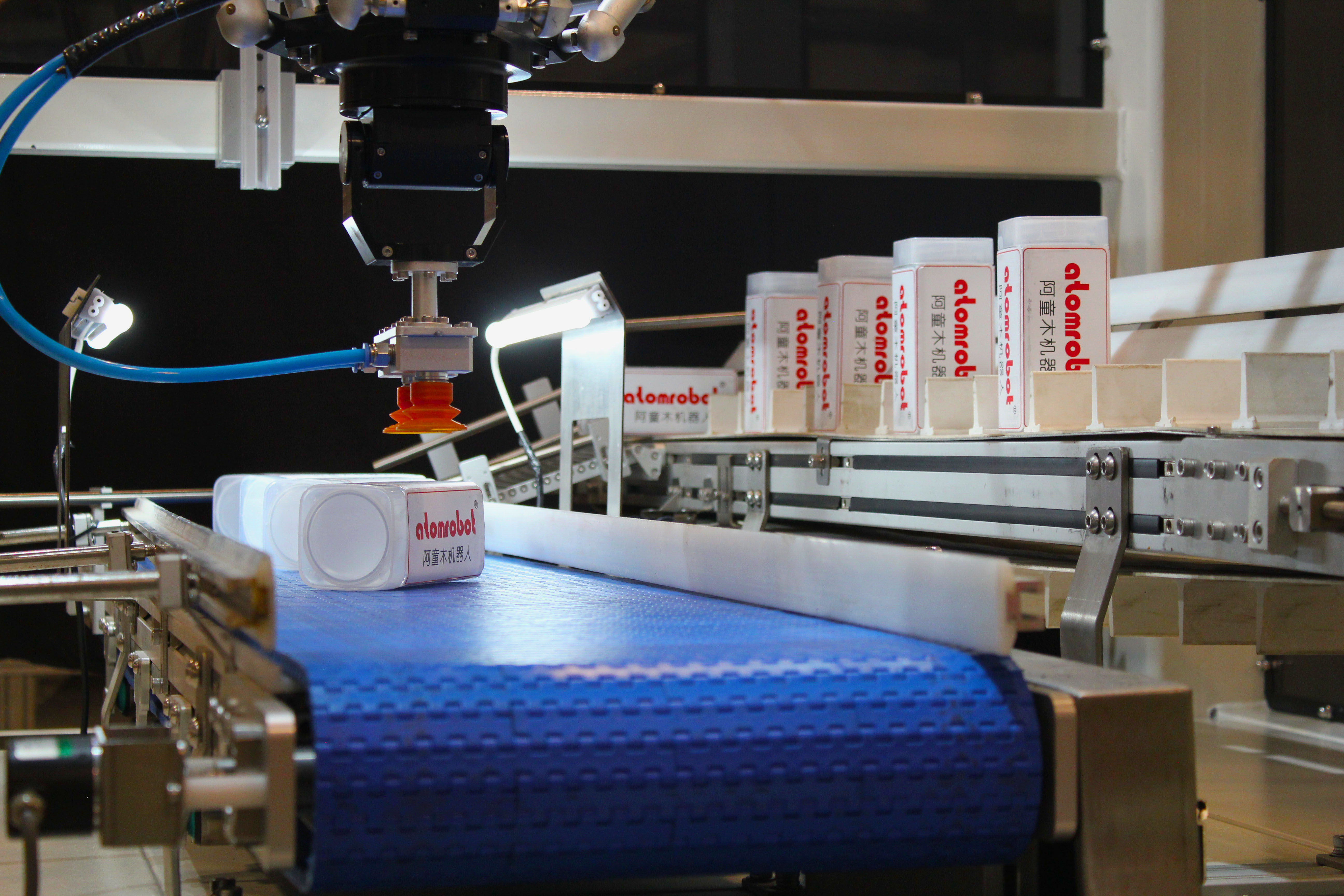 设备场景提炼于阿童木机器人经典应用场景“多机联动入槽”。双道布局的非整齐物料经视觉识别后,由之后的两台机器人随动抓取并整齐放于随动的物料槽中;物料入槽后输送至另一侧由第三台机器人,将料槽中物料取出重新摆于输送线上,依次循环。放料机器人一台使用储存式末端可连续吸取多层物料并一次性放出,另一台使用单抓末端完成高速单抓演示;取料机器人使用多抓可自转末端,完成一次性多个物料的取出以及多角度摆放。