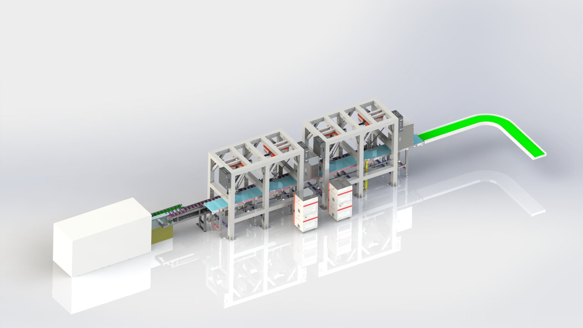 在技术创新的探索上,我们阿童木机器人针对单台包装机产能提升的趋势高速密集来料的生产特点,提出打造多台机器人联动协作分拣作业。即通过串联的形式进行布局,综合多台机器人产能,完成高速生产。