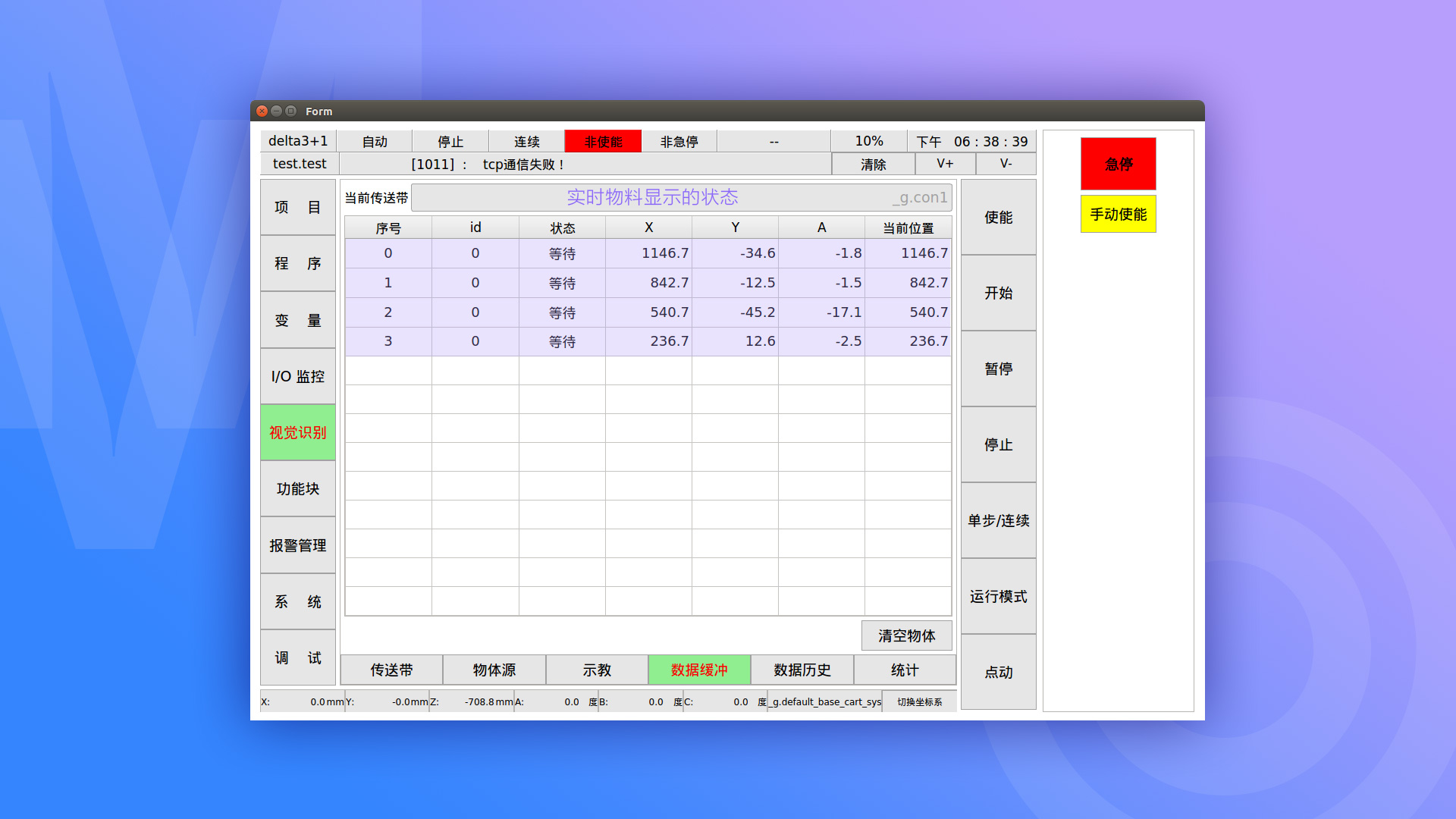 生产过程中前端视觉在收集物料信息并由控制器计算来料速度后,分配给前三台机器人平均每台140包/min的物料;最后一台则位于“捡漏”状态,不做限制,正常状态下处理100包/min,如果前端出现故障,或短时间产能增加,也可以及时进行机能补充。