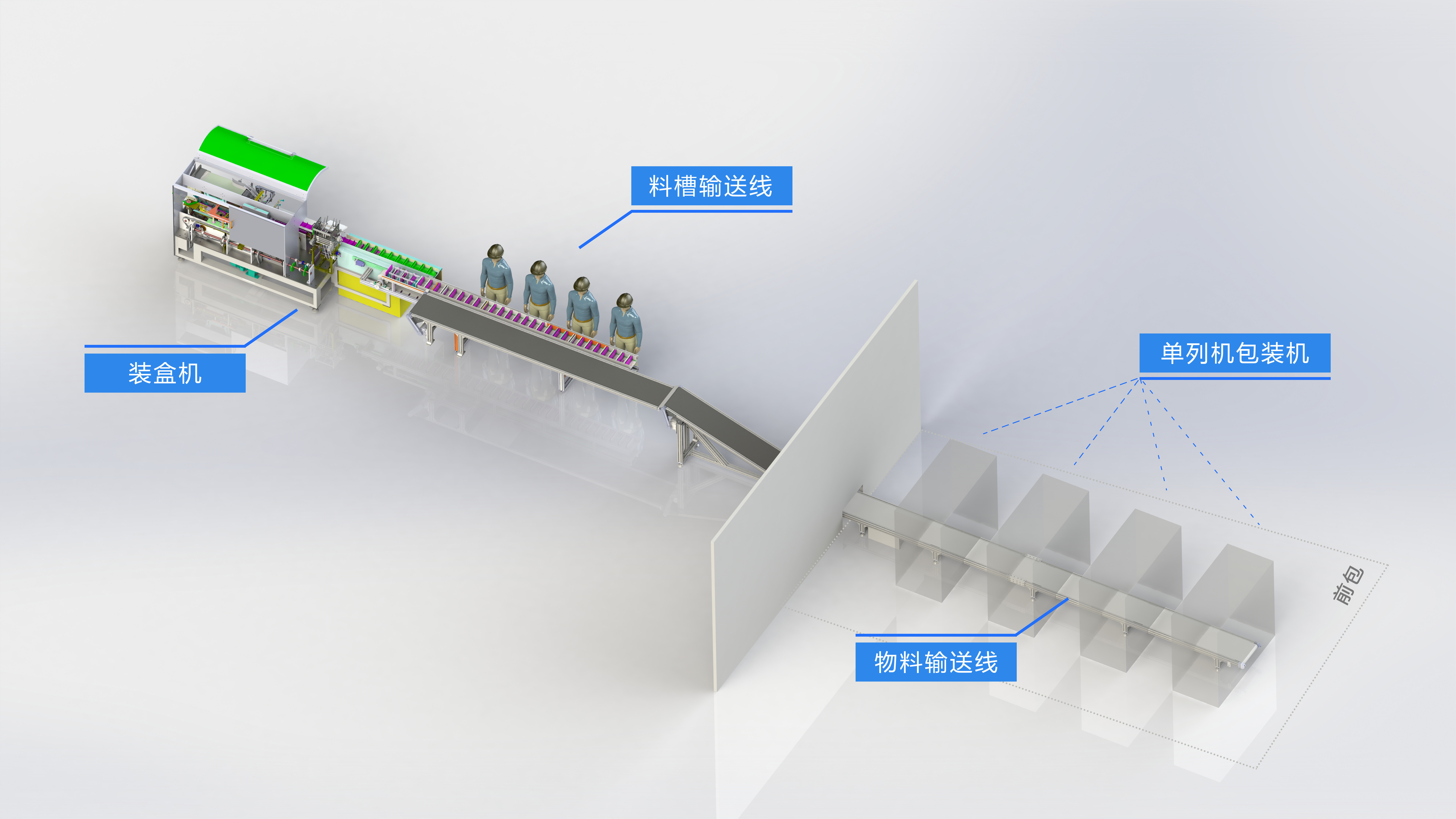 传统的颗粒袋包装产线,从原材料输入端到成品盒输出端分为“前包”和“后包”两个阶段。