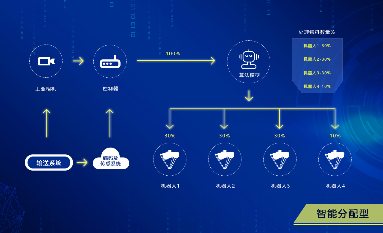 智能分配解决方案是指:物料由视觉采集后,通过分析来料密度,将物料近似平均地合理分配给多台机器人进行抓取,尽可能保证等寿命原则。且事先对空槽进行编号,物料分配过后根据每台机器人所得数量,智能分配给每台机器人特定编号的空槽进行放置。通过料槽分配算法的优化,可以保证每次抓取后等待放置的时间尽可能短,从而避免等槽的情况。