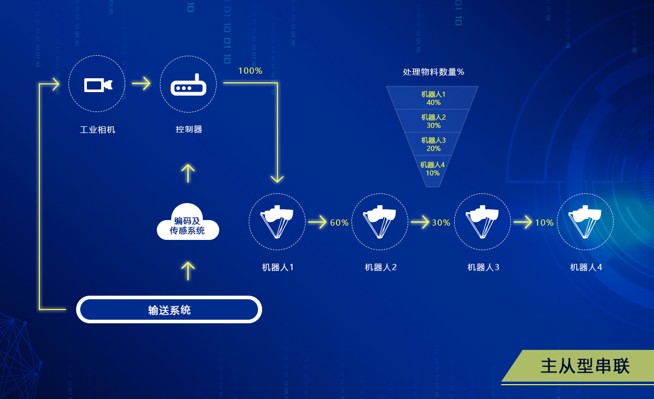 物料信息经过视觉后统一采集并发送至首台机器人做最大化处理,之后每台机器人依据自身产能极限做最大化处理,而后依次减少,最后一台同样位于“捡漏”状态。