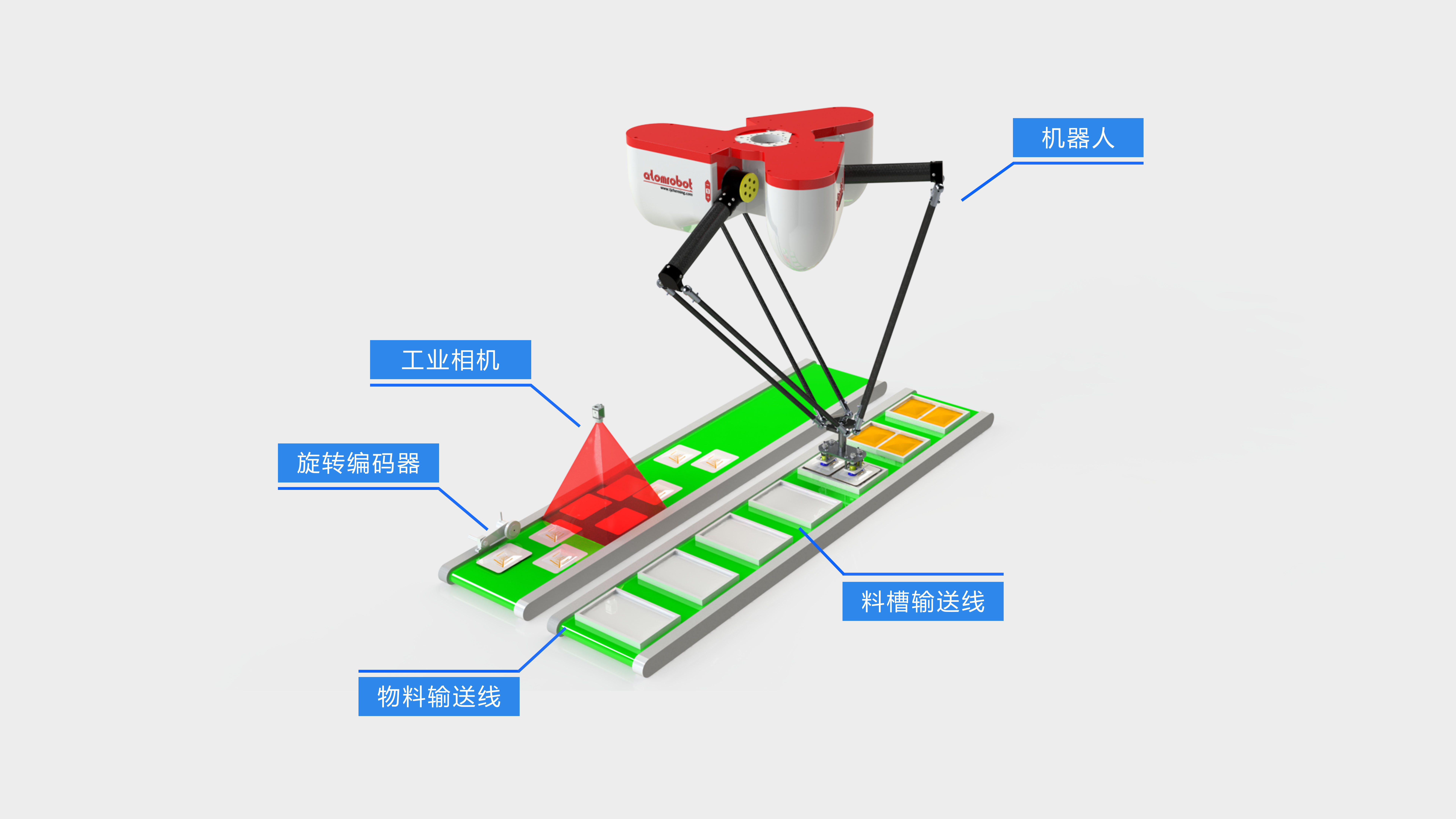 传统构型的并联自动化装槽单元主要由工业相机、机器人控制器、机器人执行本体、物料输送线、料槽输送线,旋转编码器、料槽检测传感器组成。