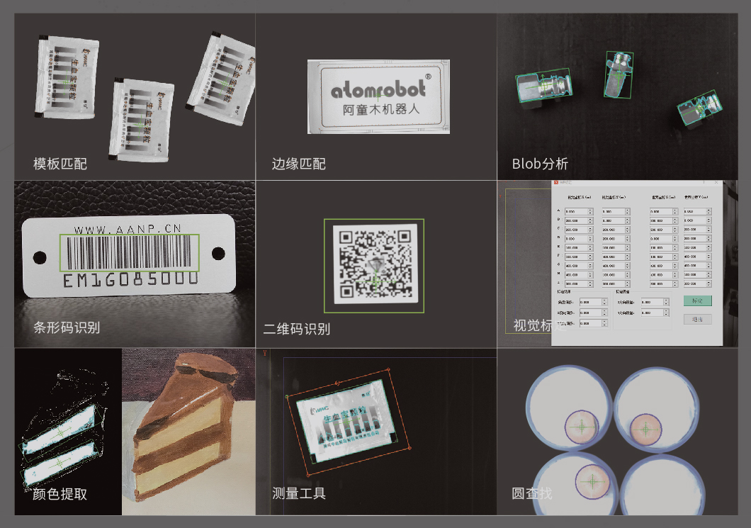其中,AtomVision是专为机器视觉识别开发的软件应用程序,适用于工业并联、串联机器人等环境,实现图像转换,颜色提取,相机标定,图像校正,物体定位,码值读取,通信等功能。支持同时连接多个相机,处理多个流程。