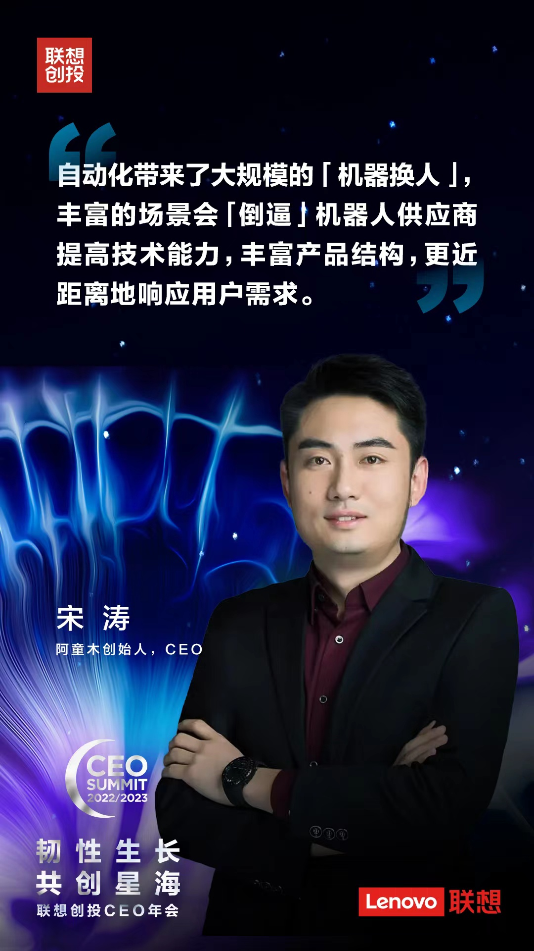 2月24日,以“韧性生长 共创星海”为主题的联想创投2022/2023 CEO年会在北京召开,联想集团董事长兼CEO杨元庆,联想集团高级副总裁、联想创投集团总裁贺志强,智源研究院理事长张宏江,国际欧亚科学院院士樊建平等350+LP、科学家、经济学家、科技创业者相聚于春天,共襄一场科技思想的盛宴。阿童木机器人CEO宋涛应邀出席活动。