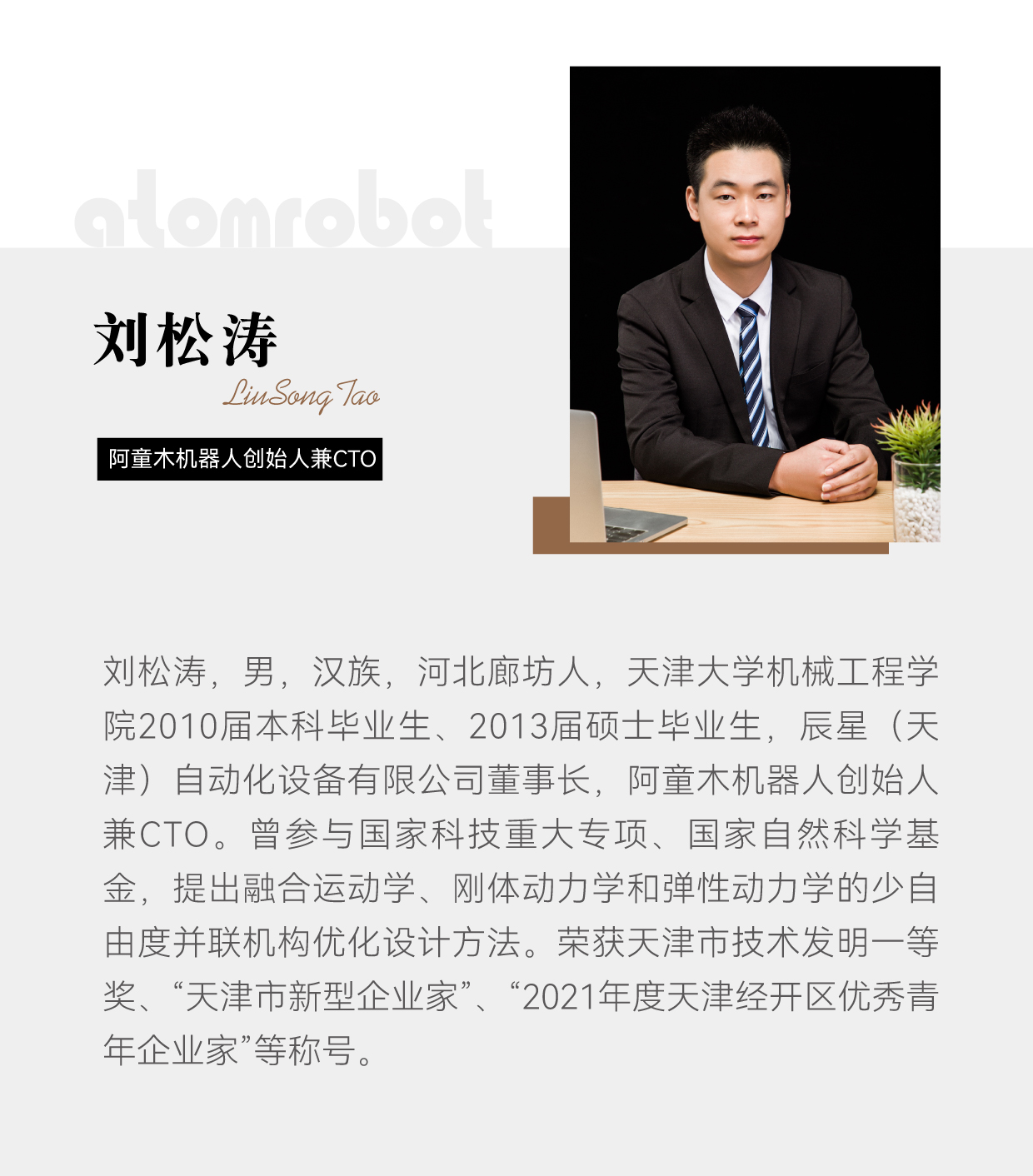 2013年,硕士在读时,刘松涛创办了辰星(天津)自动化设备有限公司,打造“阿童木机器人”高端并联机器人品牌,不到十年时间,公司发展为并联机器人领域知名的制造商与供应商,拥有全系列并联机器人核心自主知识产权,广受客户的认可和信赖,推动国家工业自动化进程。