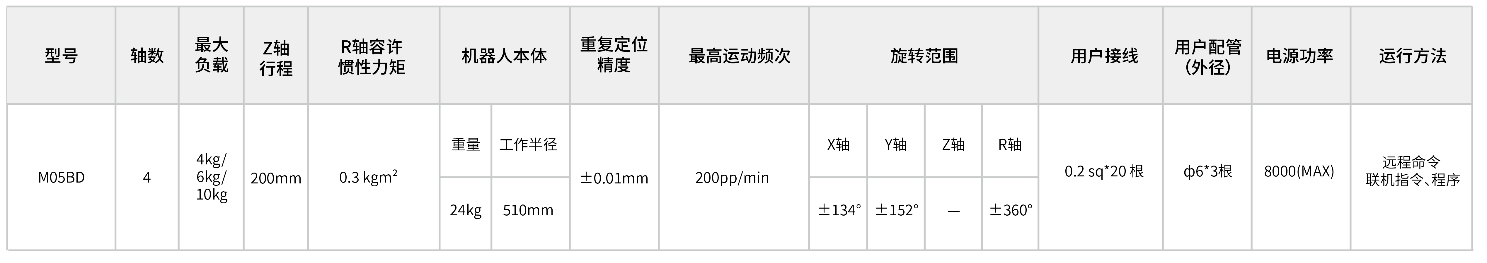 机器人臂展范围 510mm,大臂旋转角度可达±134°,小臂旋转角达到±152°,工作空间最大可覆盖直径 1020mm 的广扇形区域,可满足多工位长距离的搬运、分拣和装配作业。