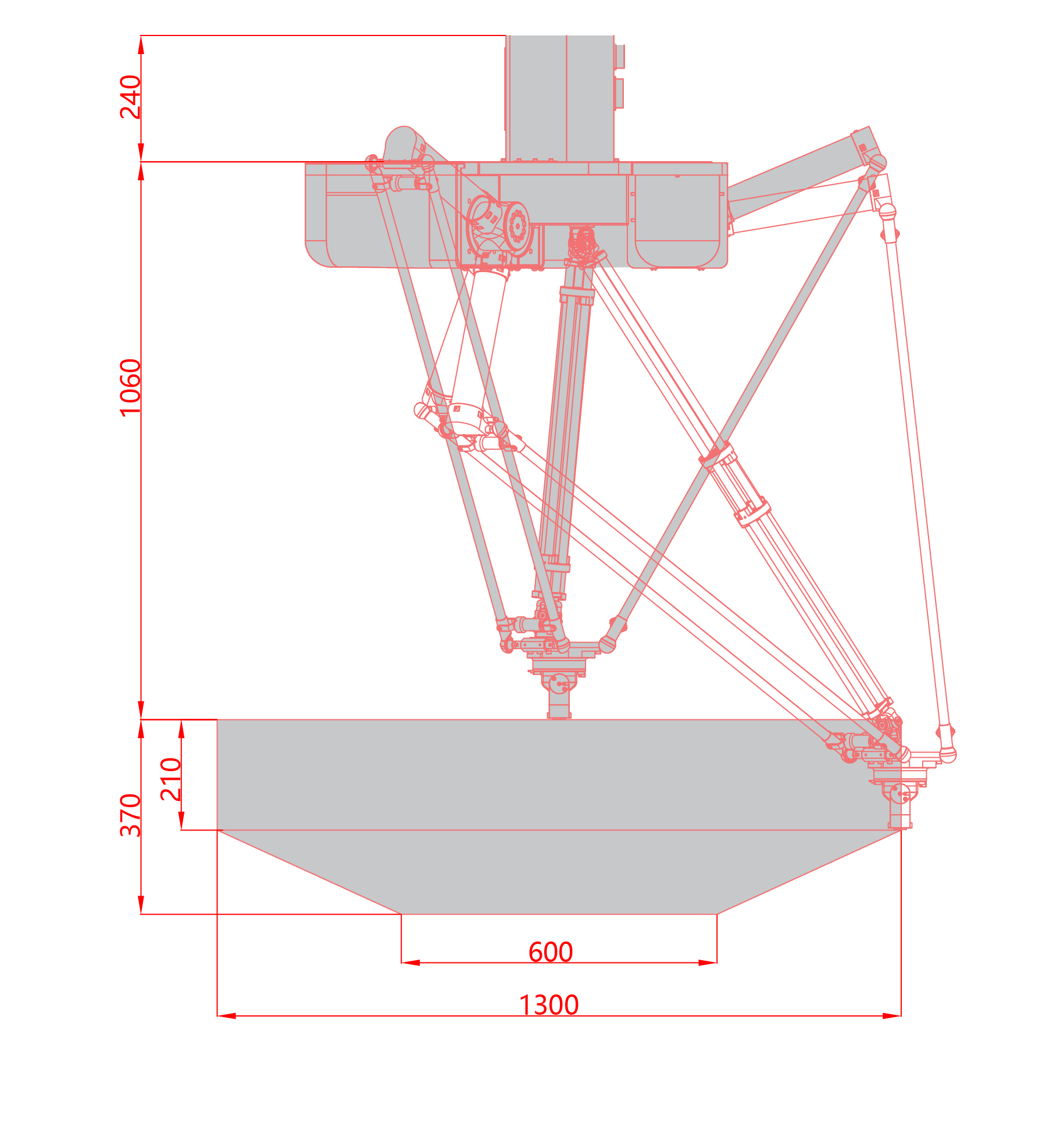 5轴机器人在传统三轴并联机器人基础上,增加两根平行旋转轴,通过一轴控制水平转动,另一轴控制垂直方向旋转;两中间轴采用伺服耦合控制,具备更高的精度,更快的速度,更长的使用寿命。