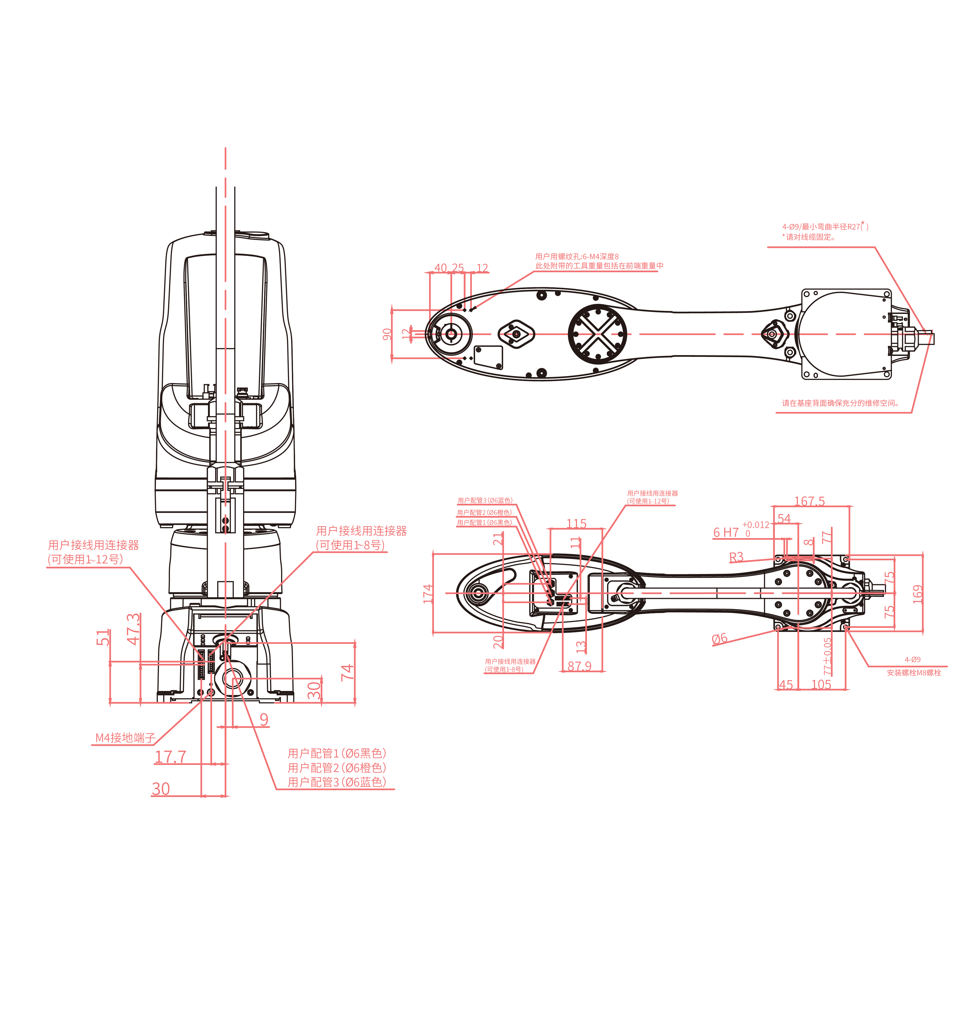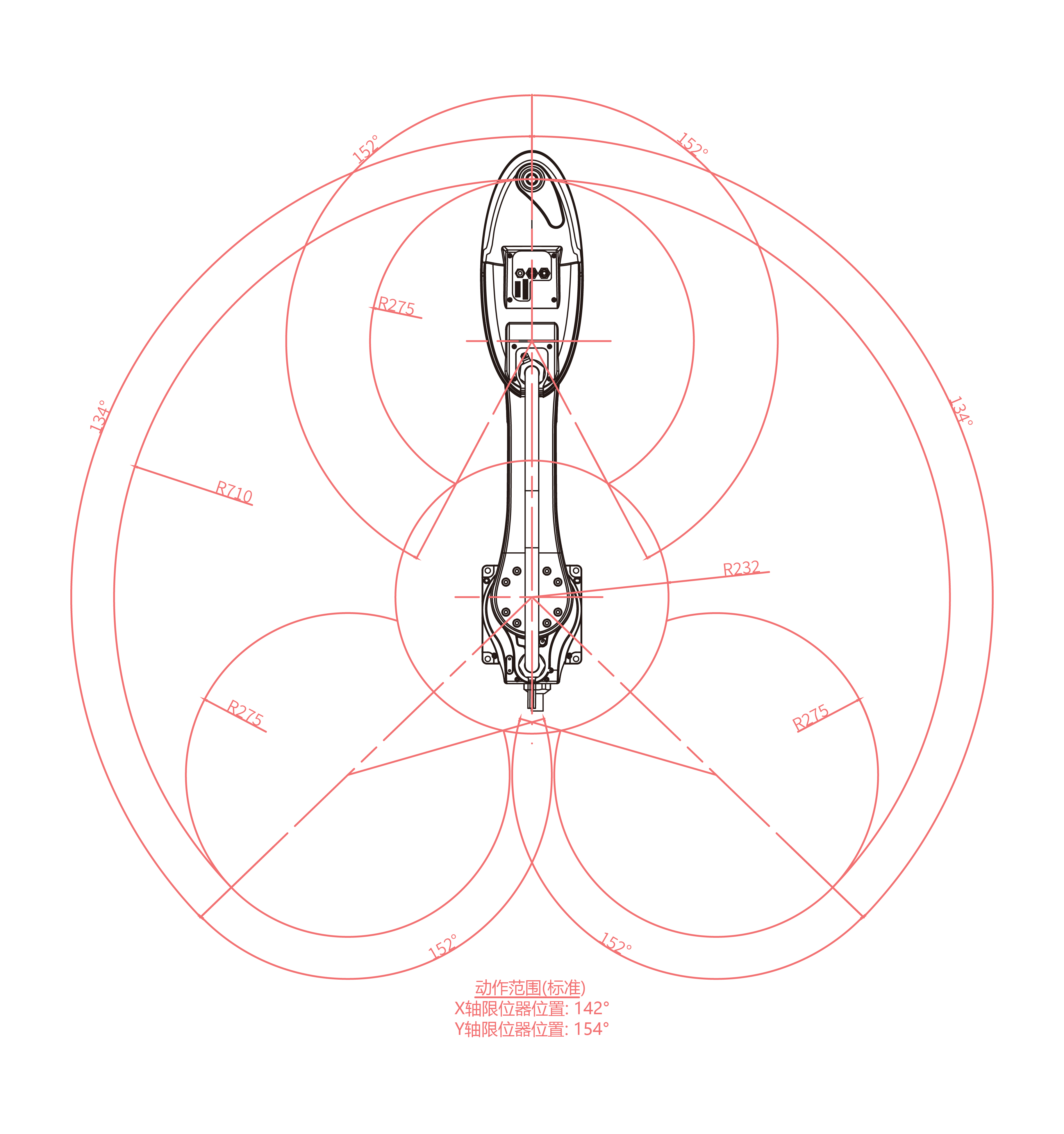 机器人臂展范围 710mm,大臂旋转角度可达±134°,小臂旋转角达到±152°,工作空间最大可覆盖直径 1420mm 的广扇形区域,可满足多工位长距离的搬运、分拣和装配作业。